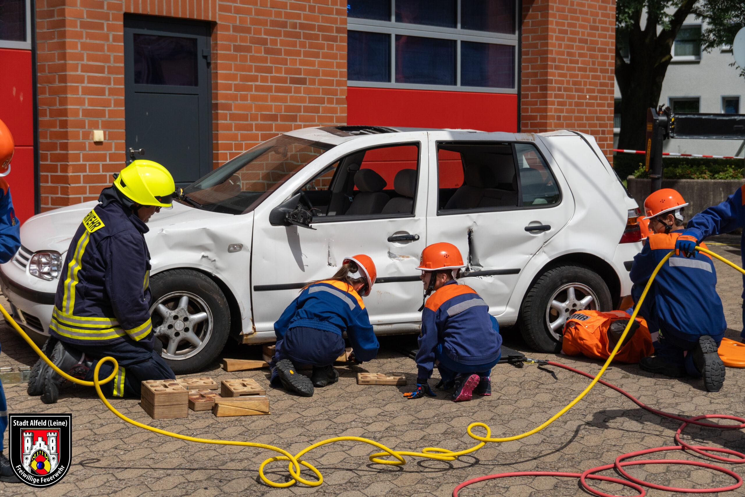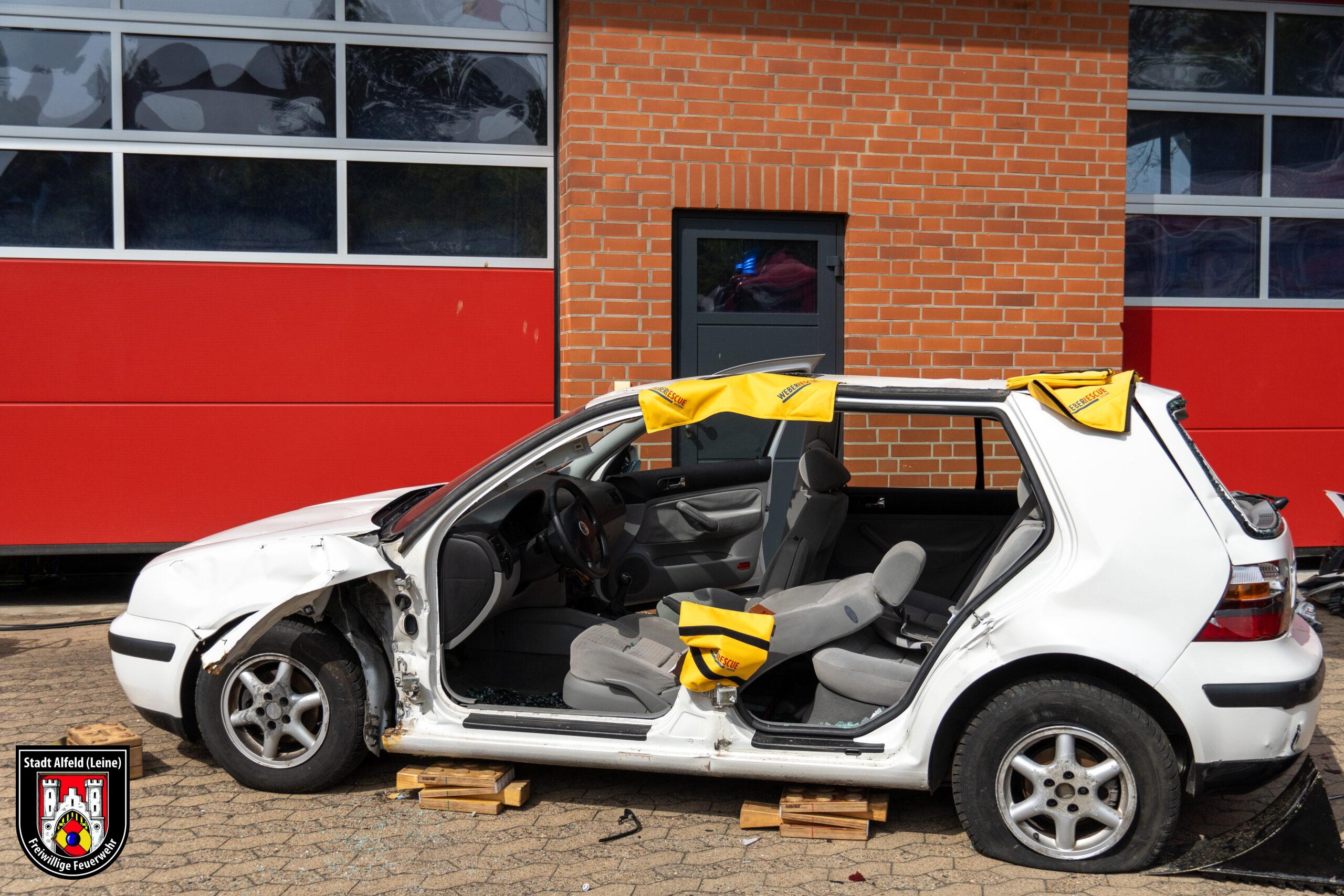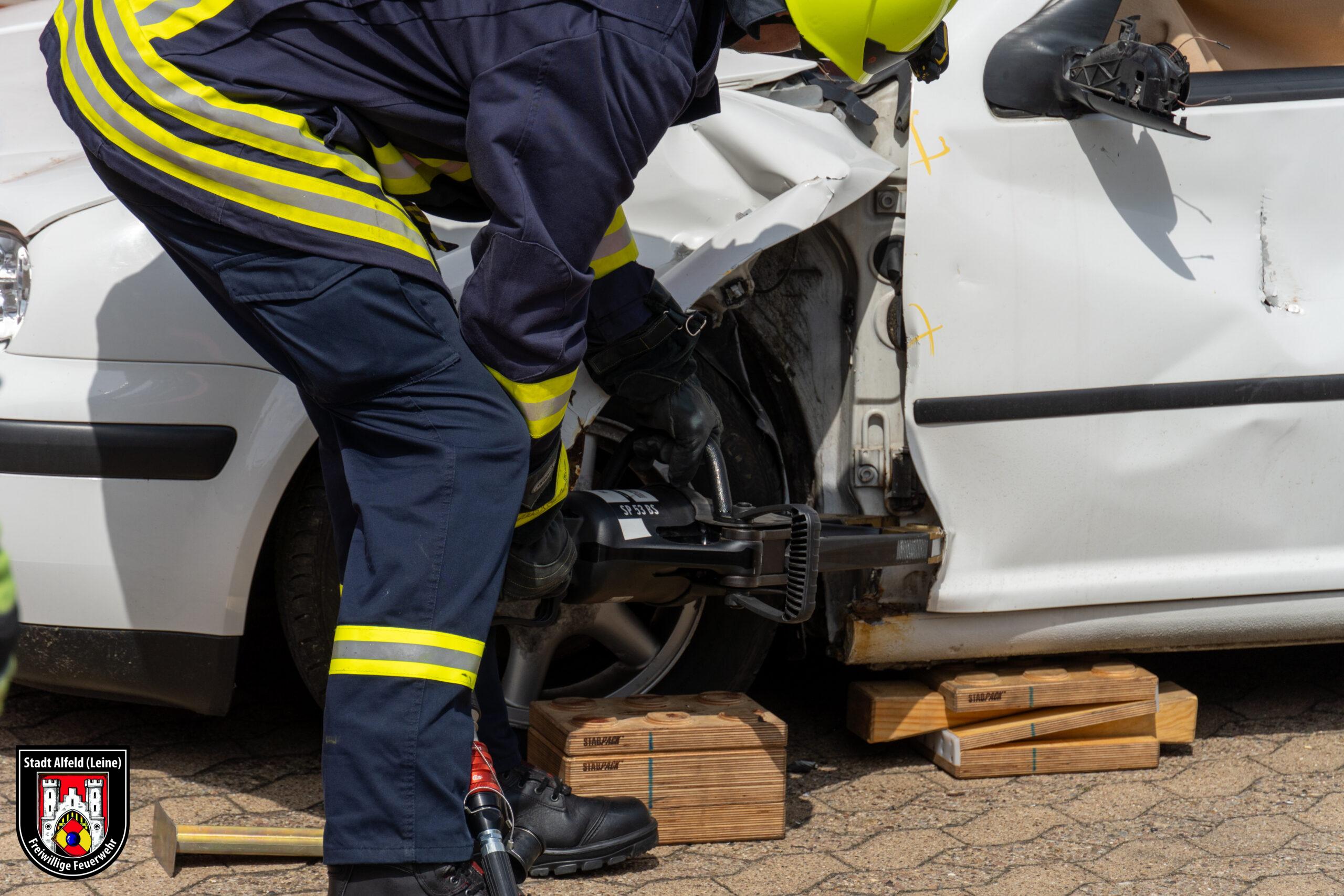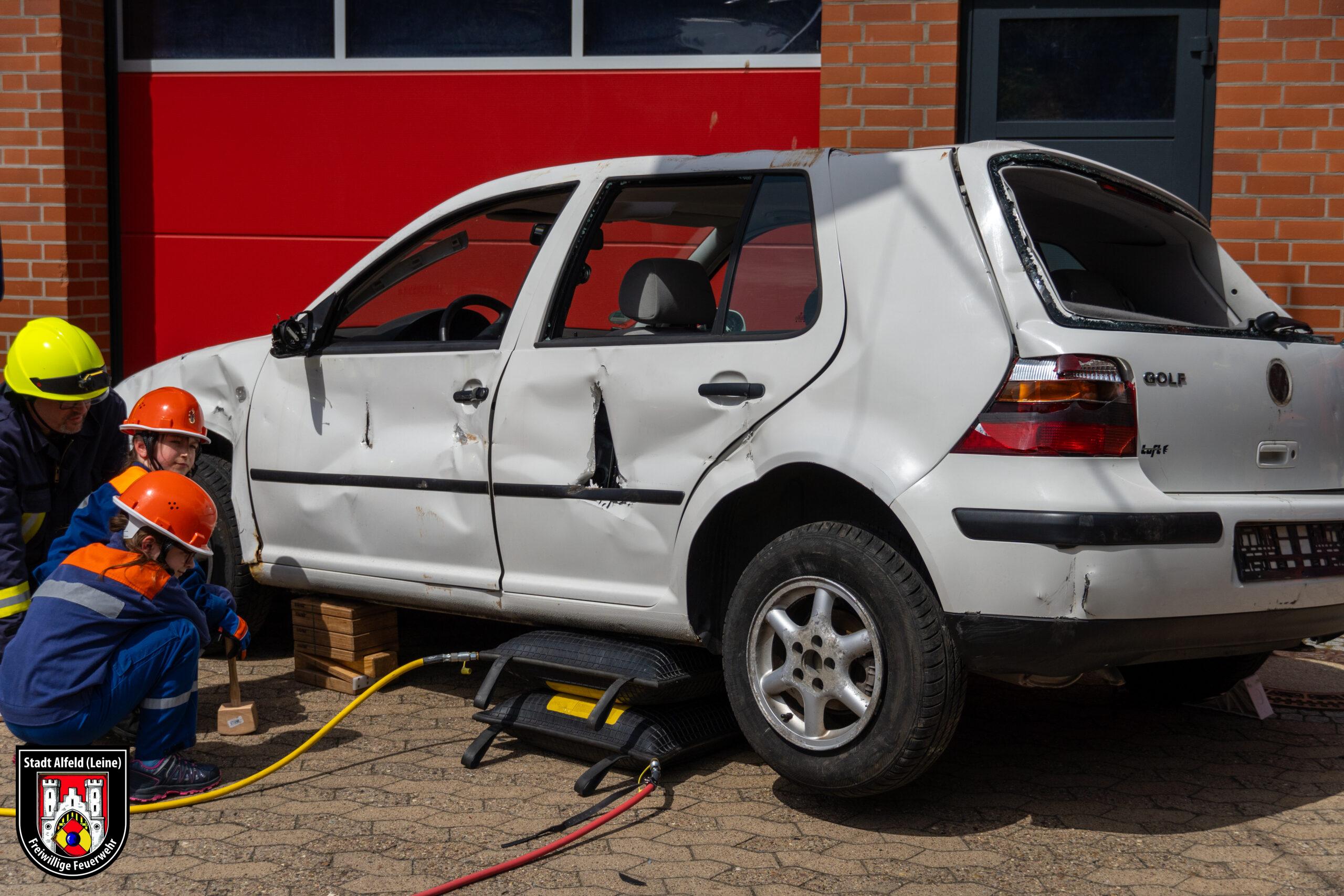 Die Jugendfeuerwehr befreite eine Person die unter einem Auto eingeklemmt war mit Hilfe unserer Hebekissen.