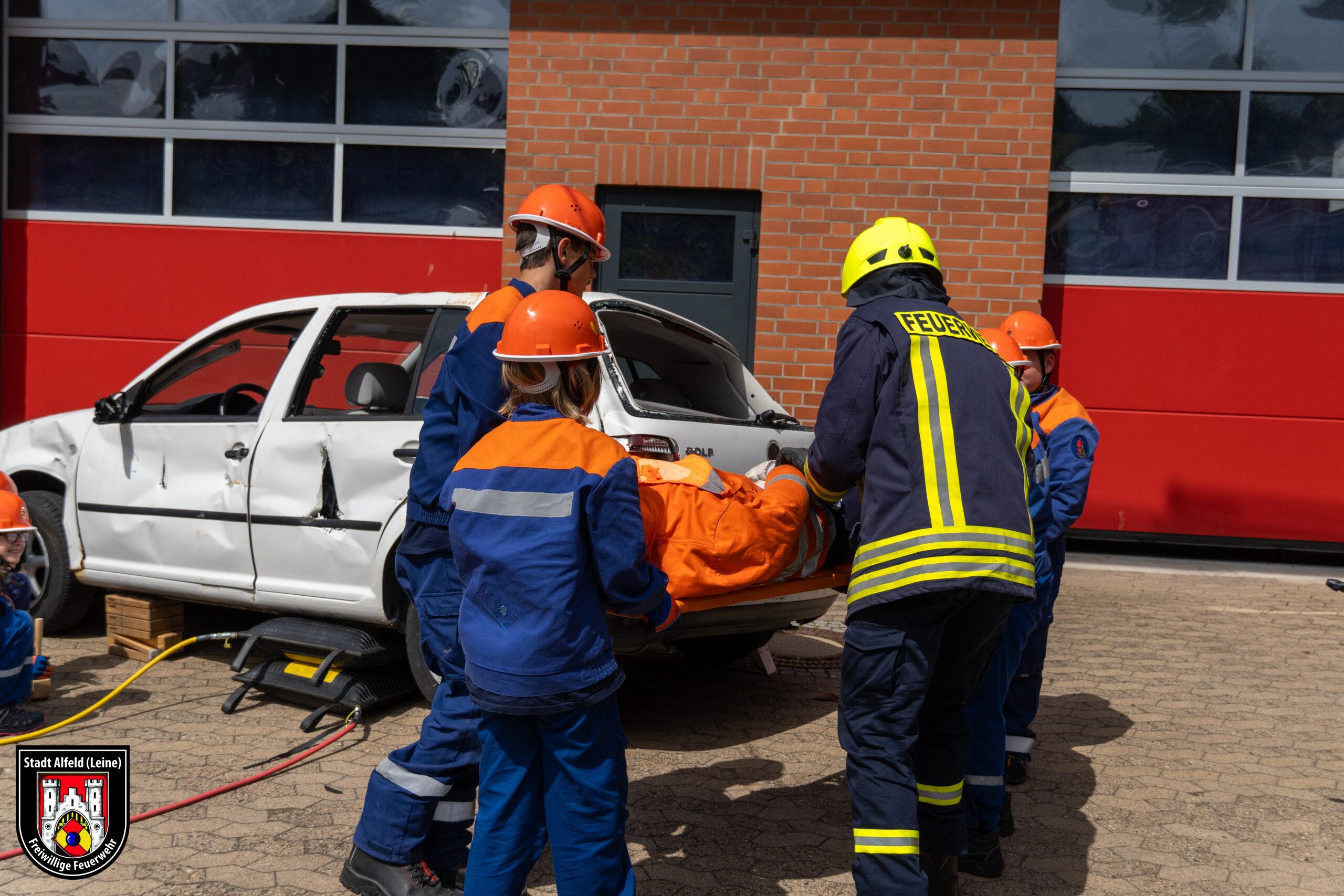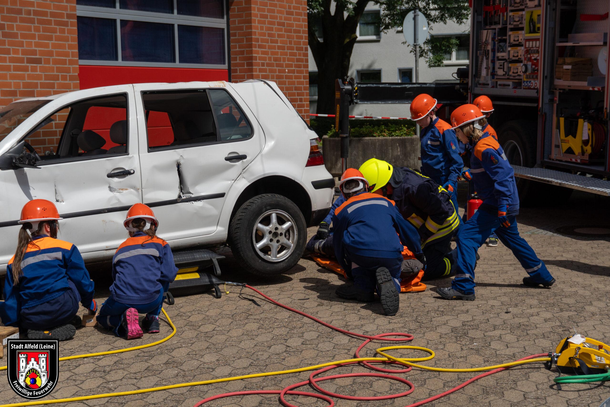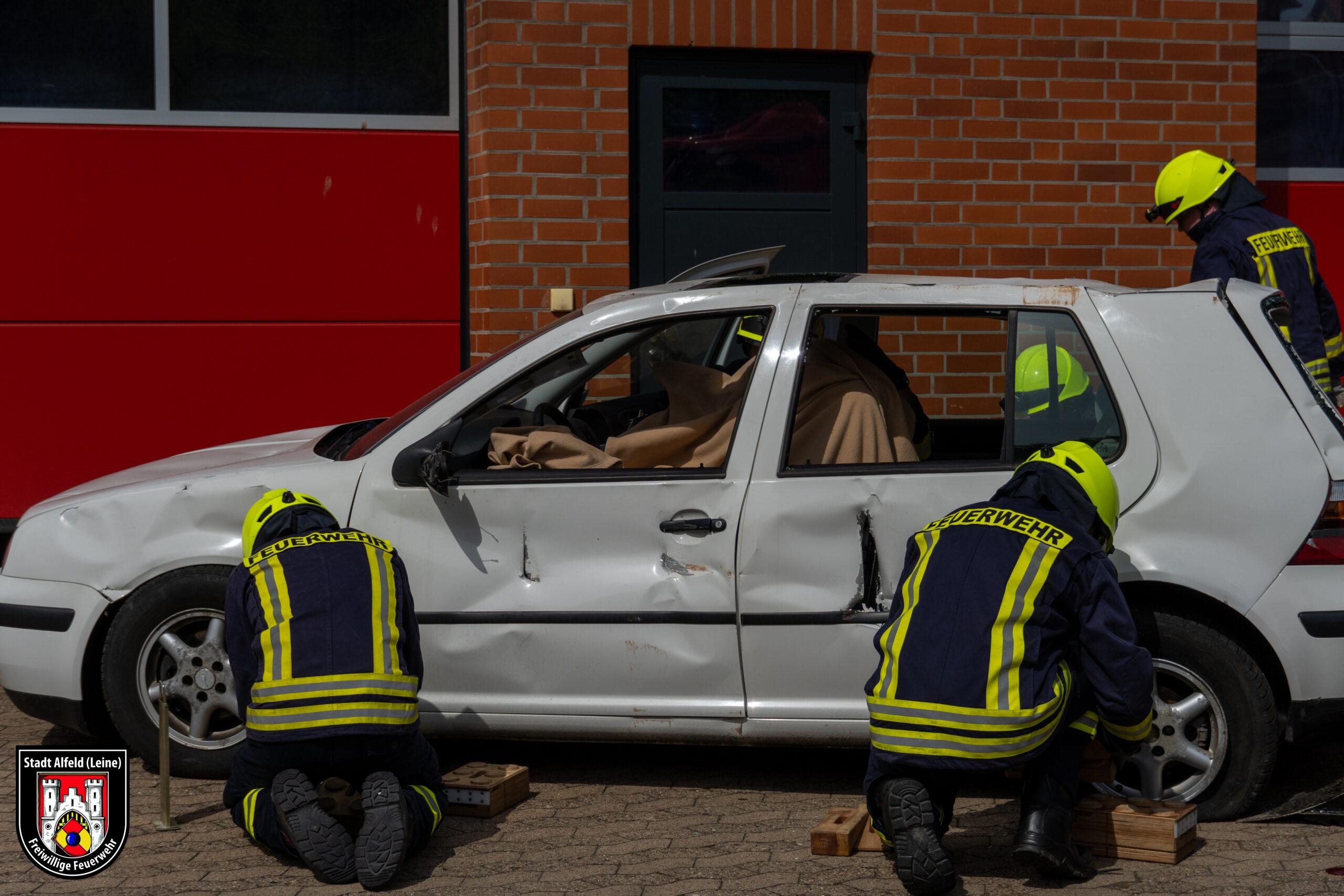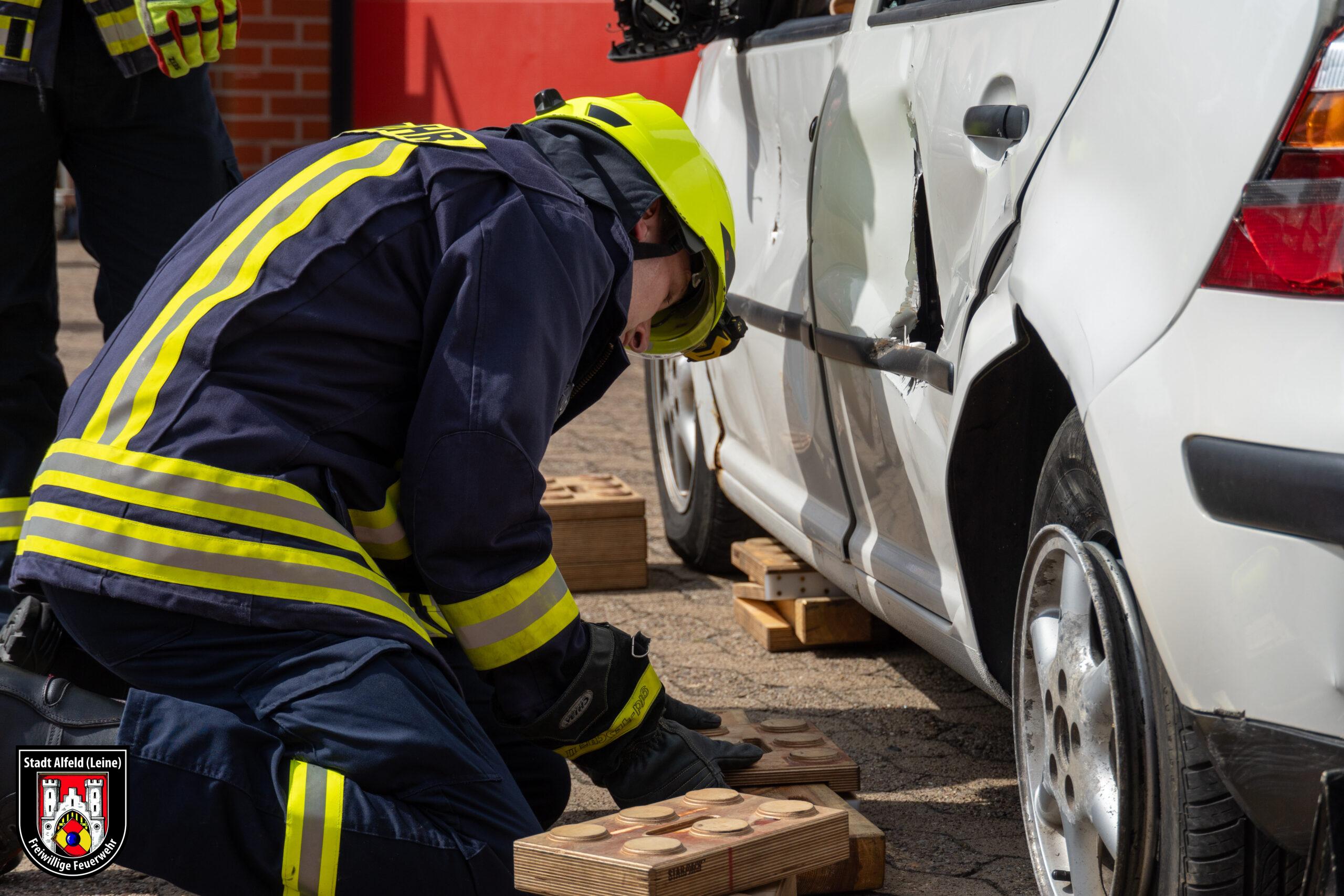 Die Jugendfeuerwehr befreite eine Person die unter einem Auto eingeklemmt war mit Hilfe unserer Hebekissen.