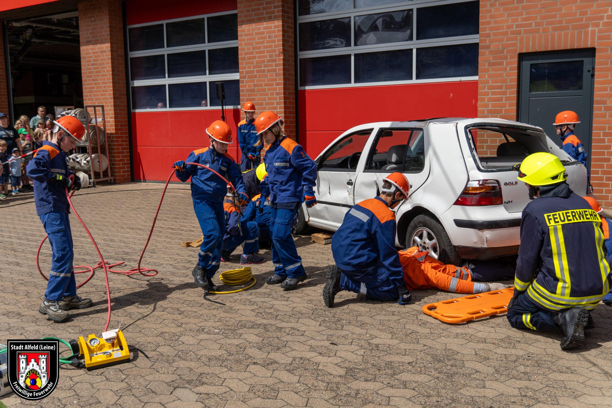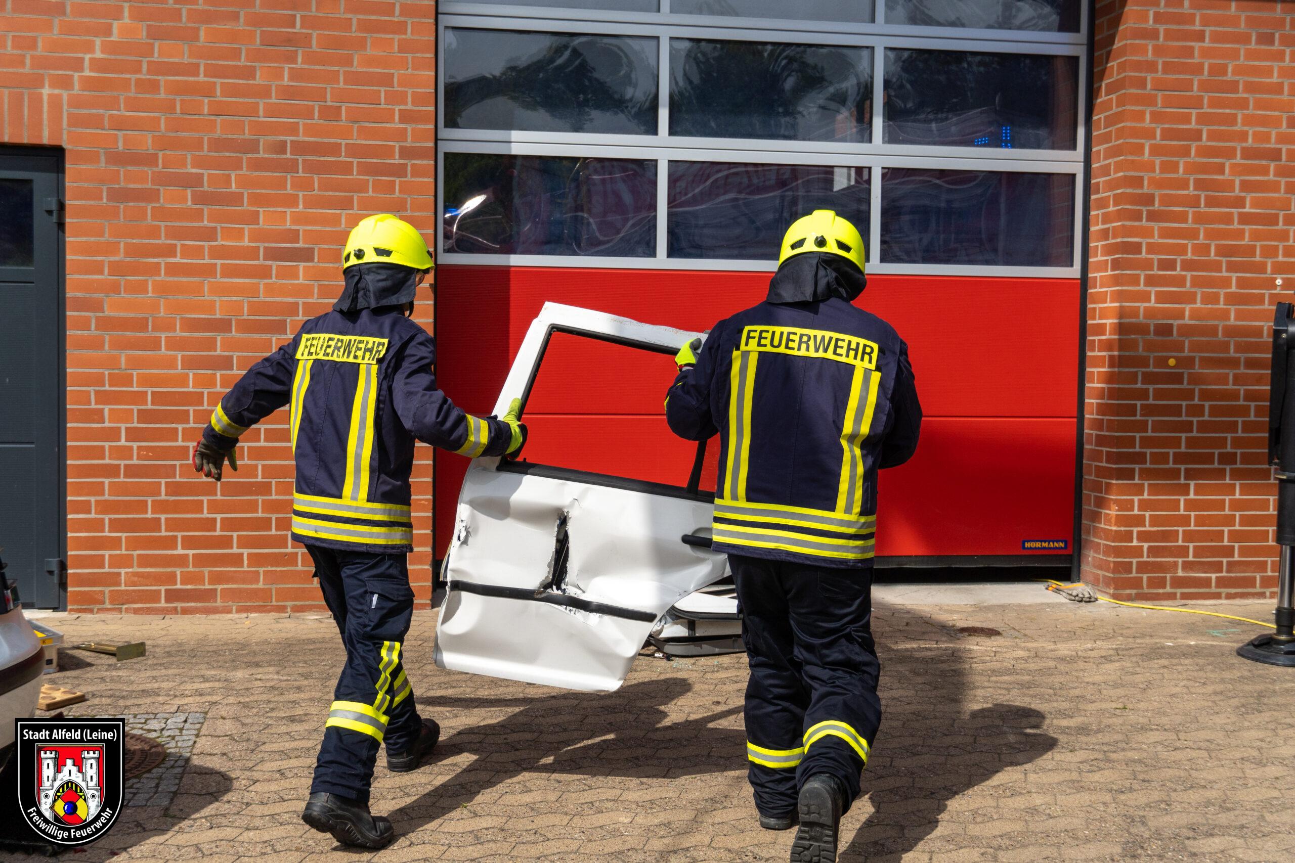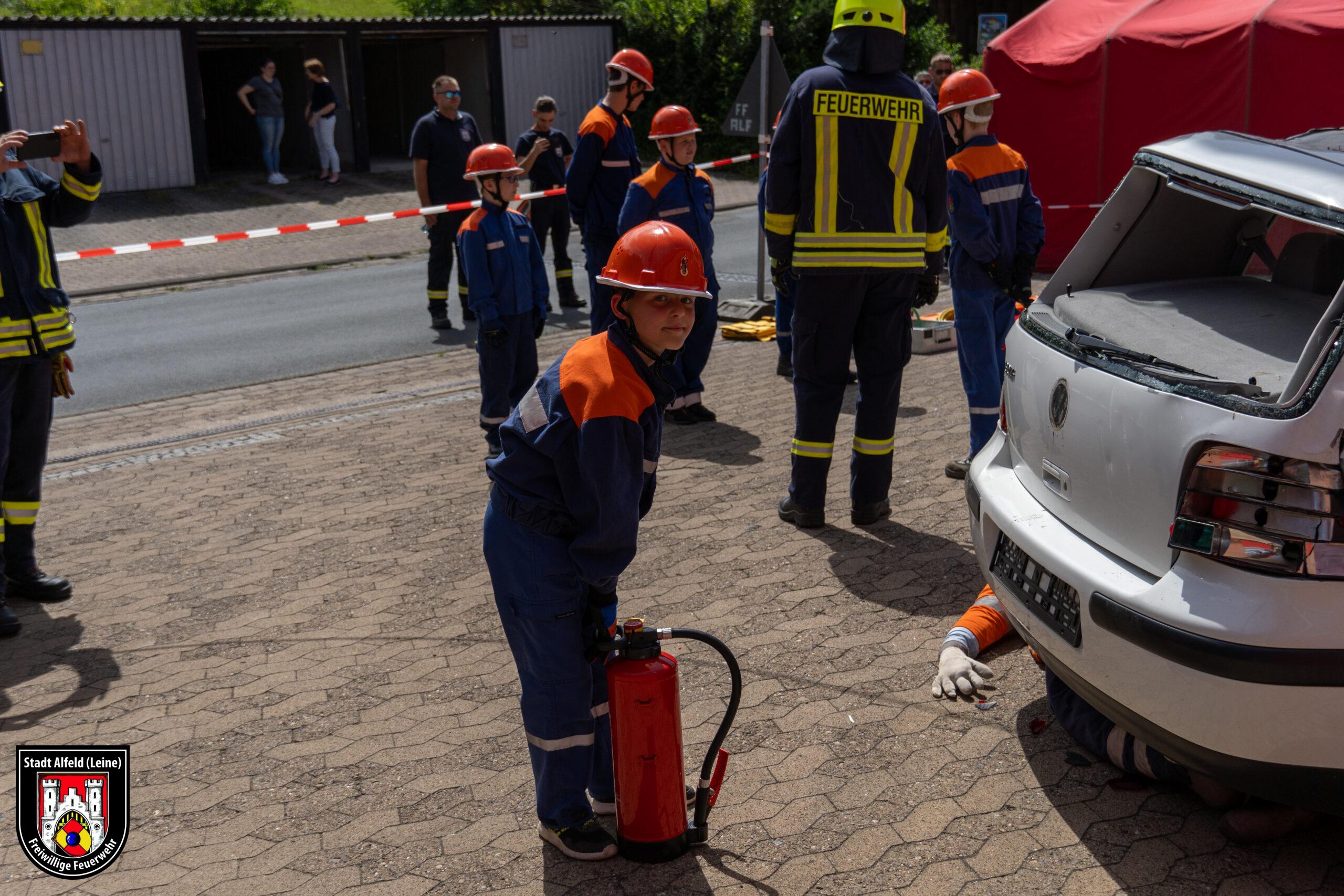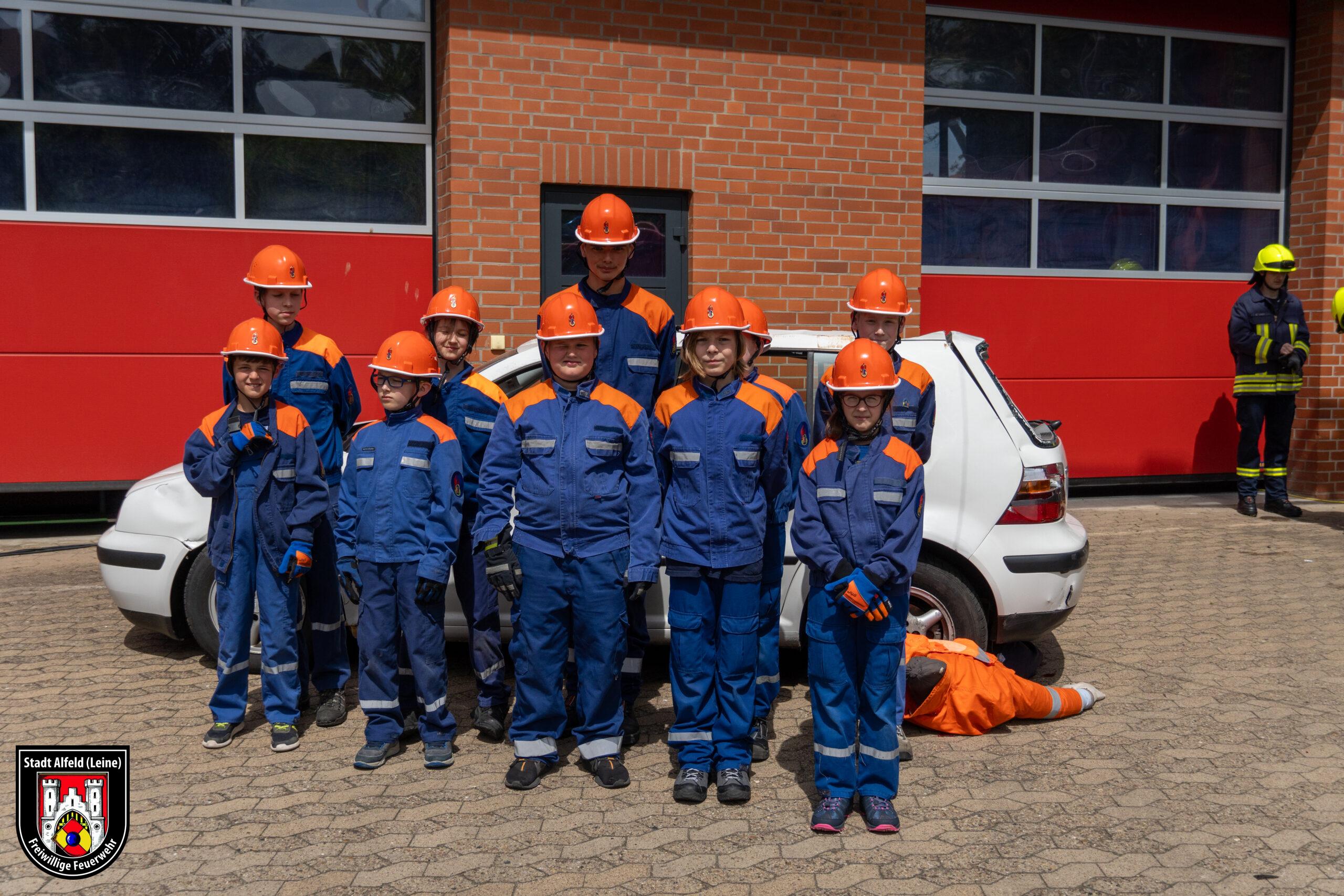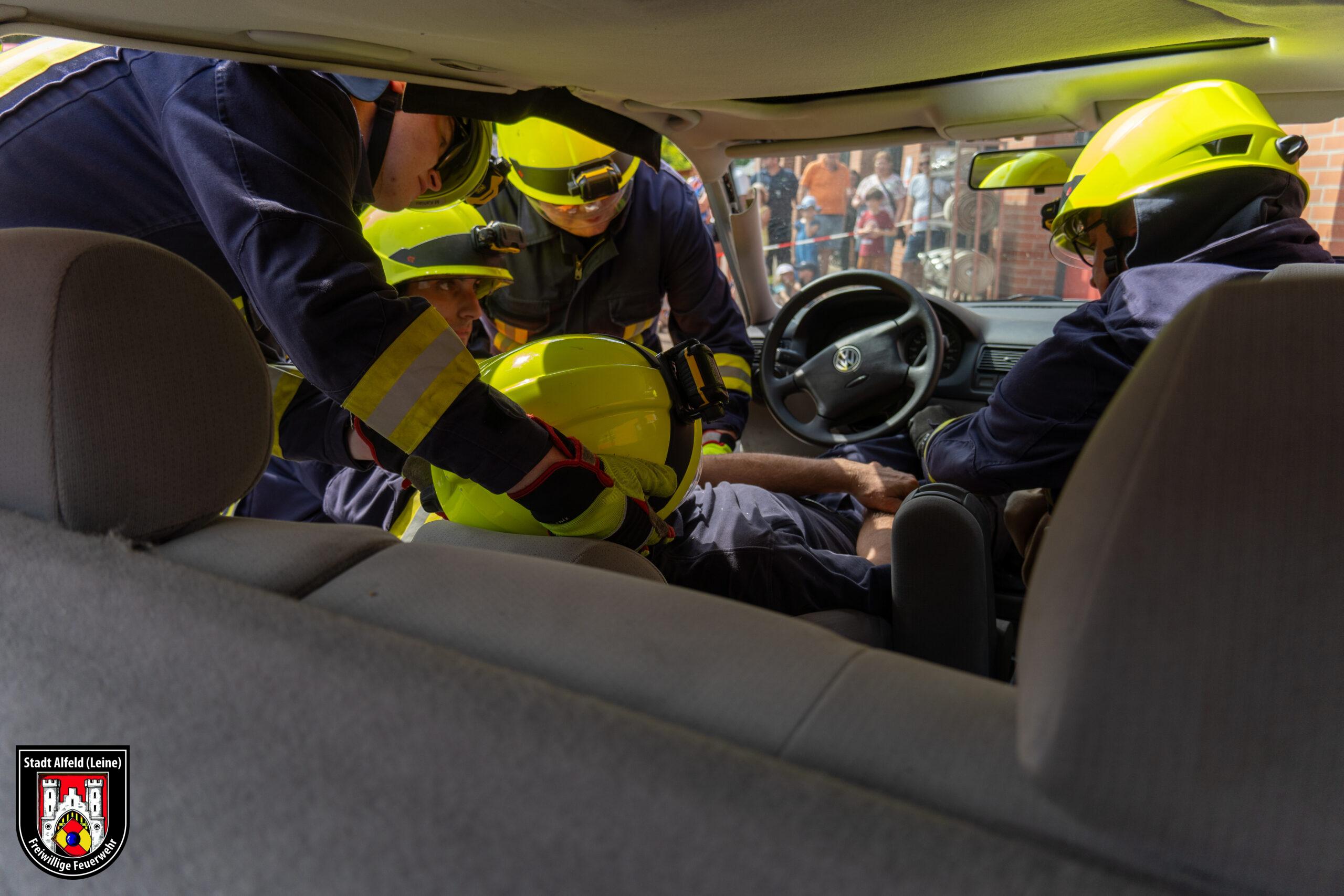 Die Jugendfeuerwehr befreite eine Person die unter einem Auto eingeklemmt war mit Hilfe unserer Hebekissen.