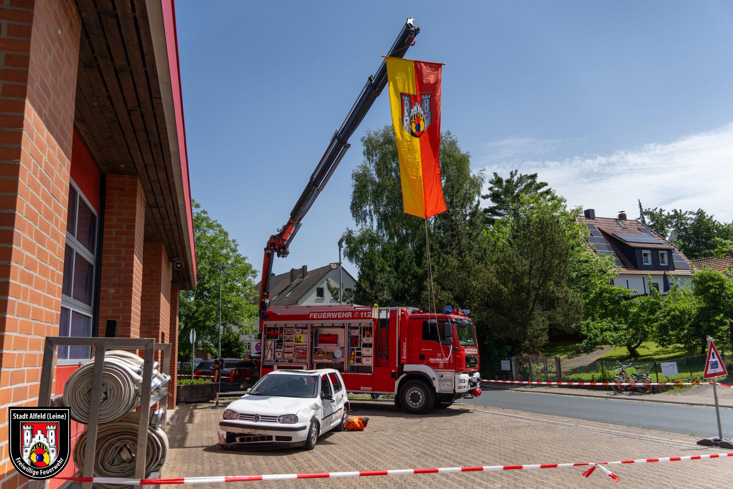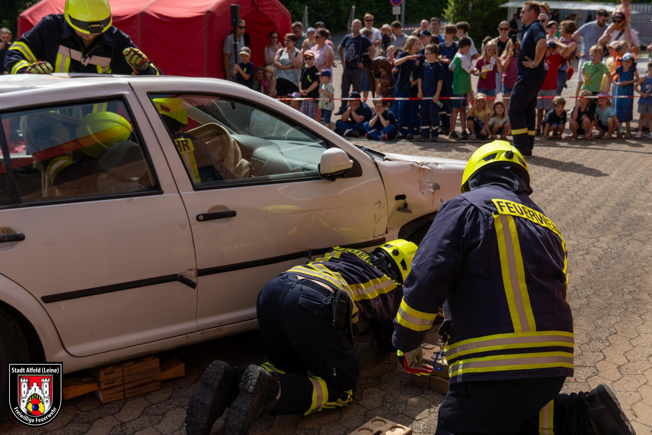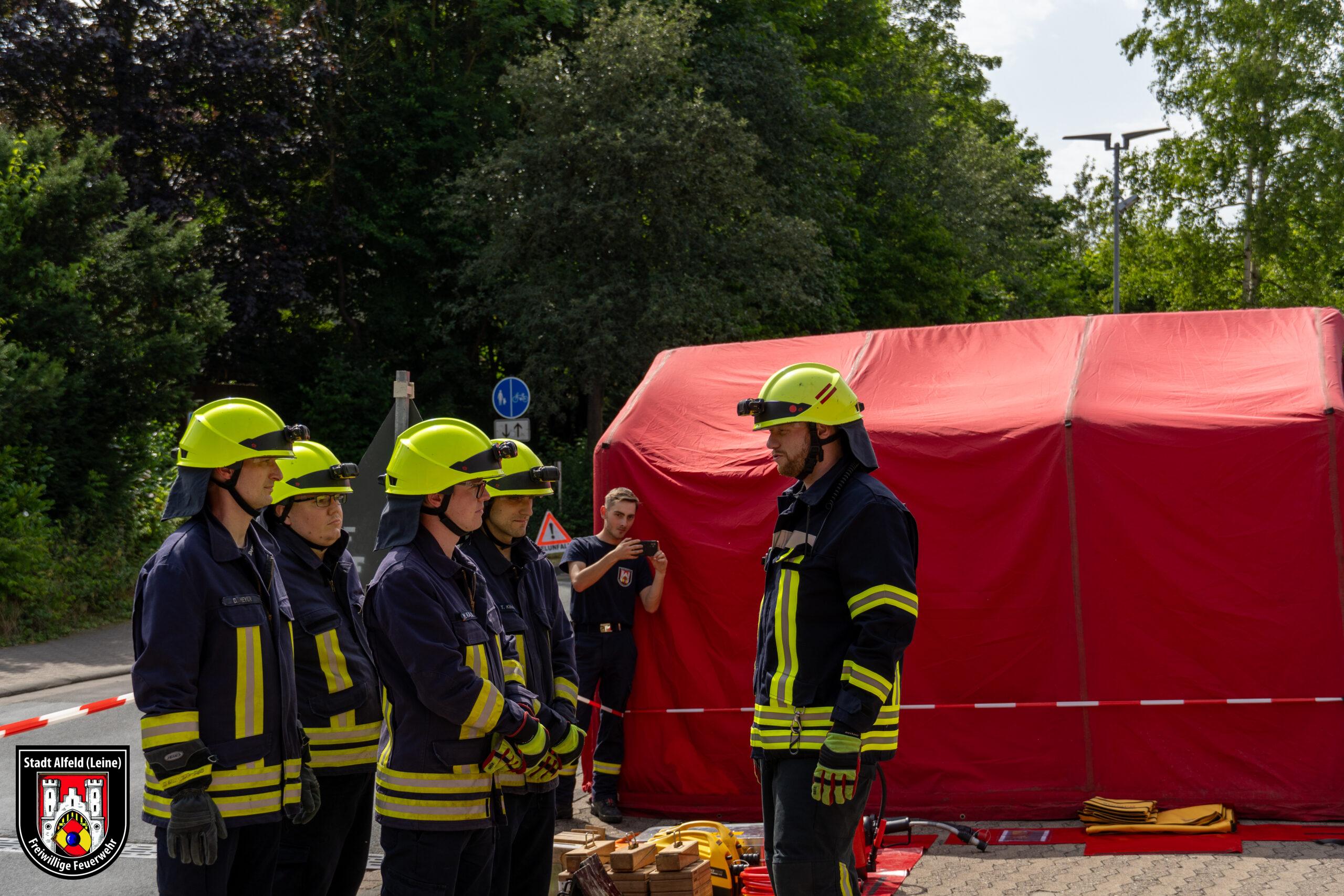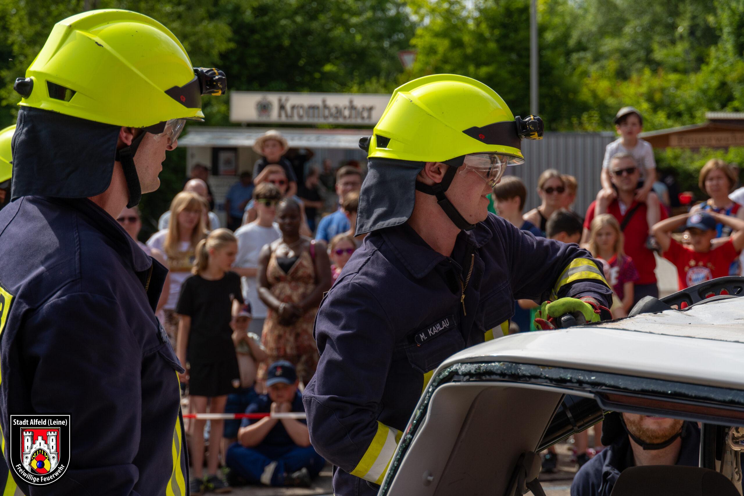 Die Jugendfeuerwehr befreite eine Person die unter einem Auto eingeklemmt war mit Hilfe unserer Hebekissen.