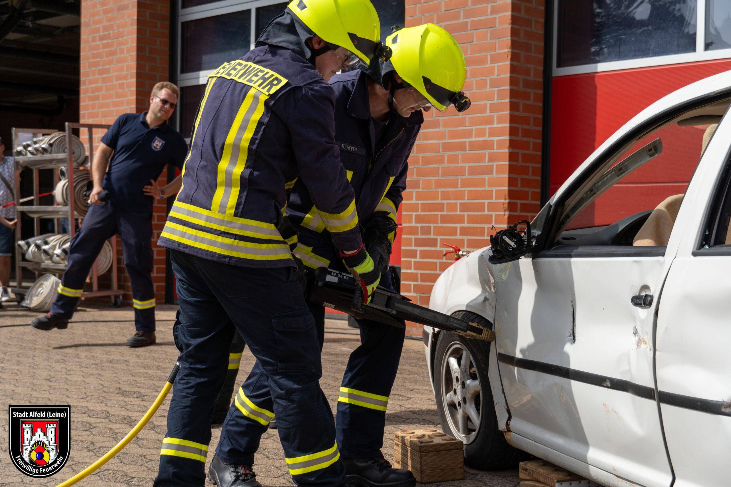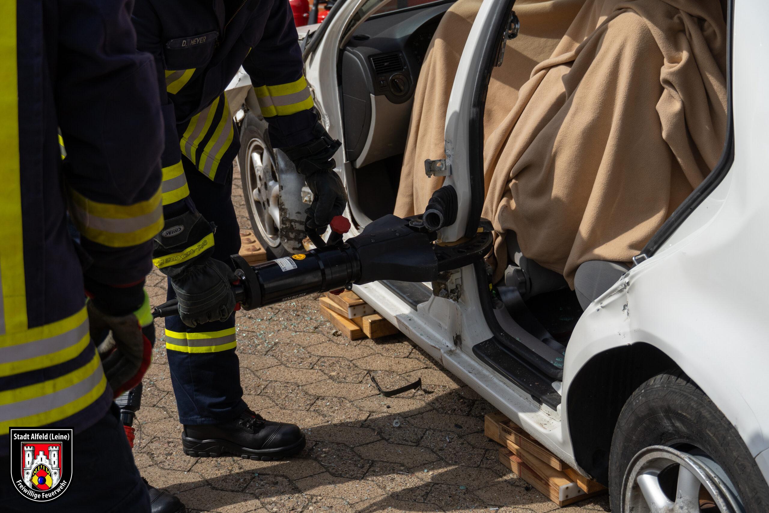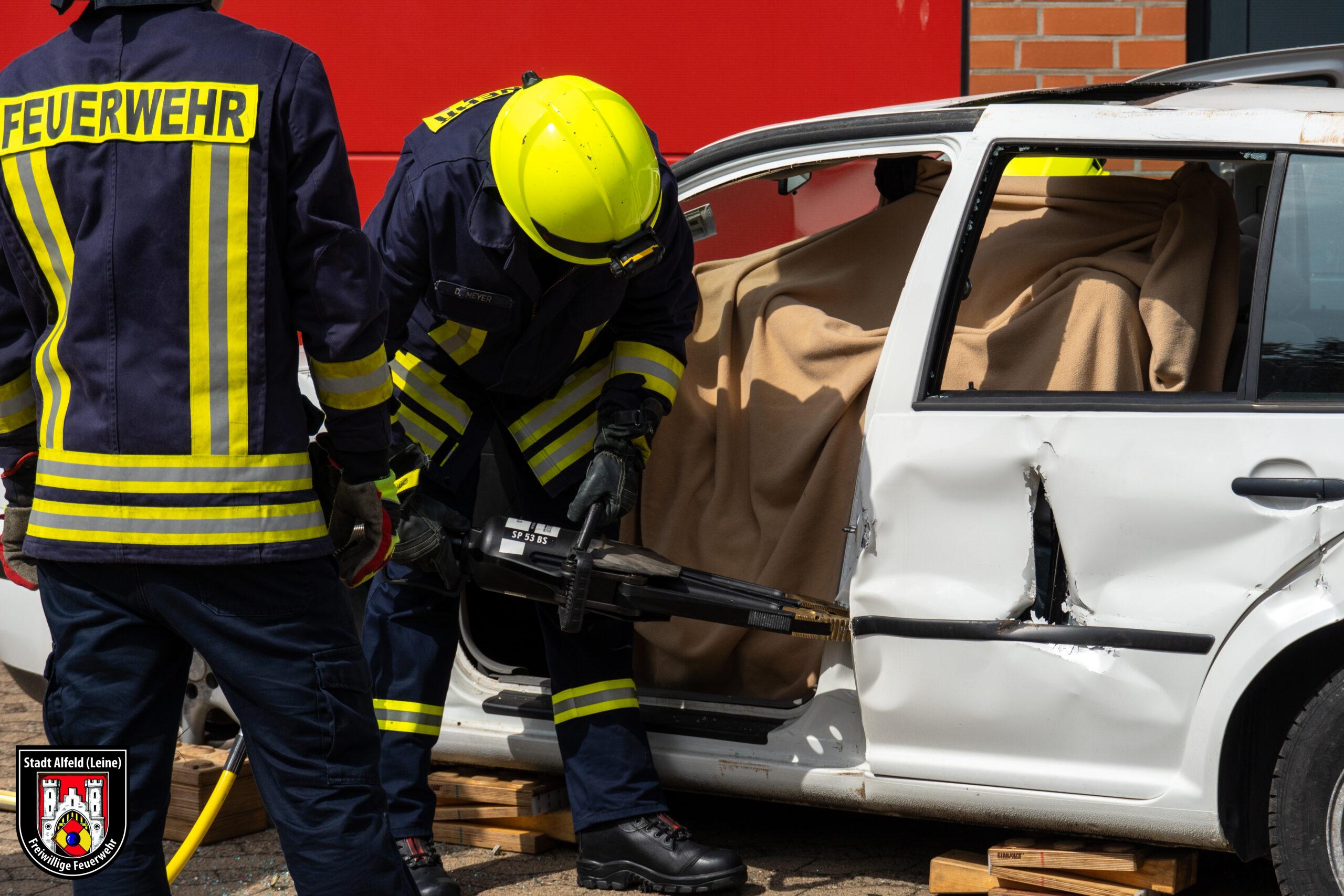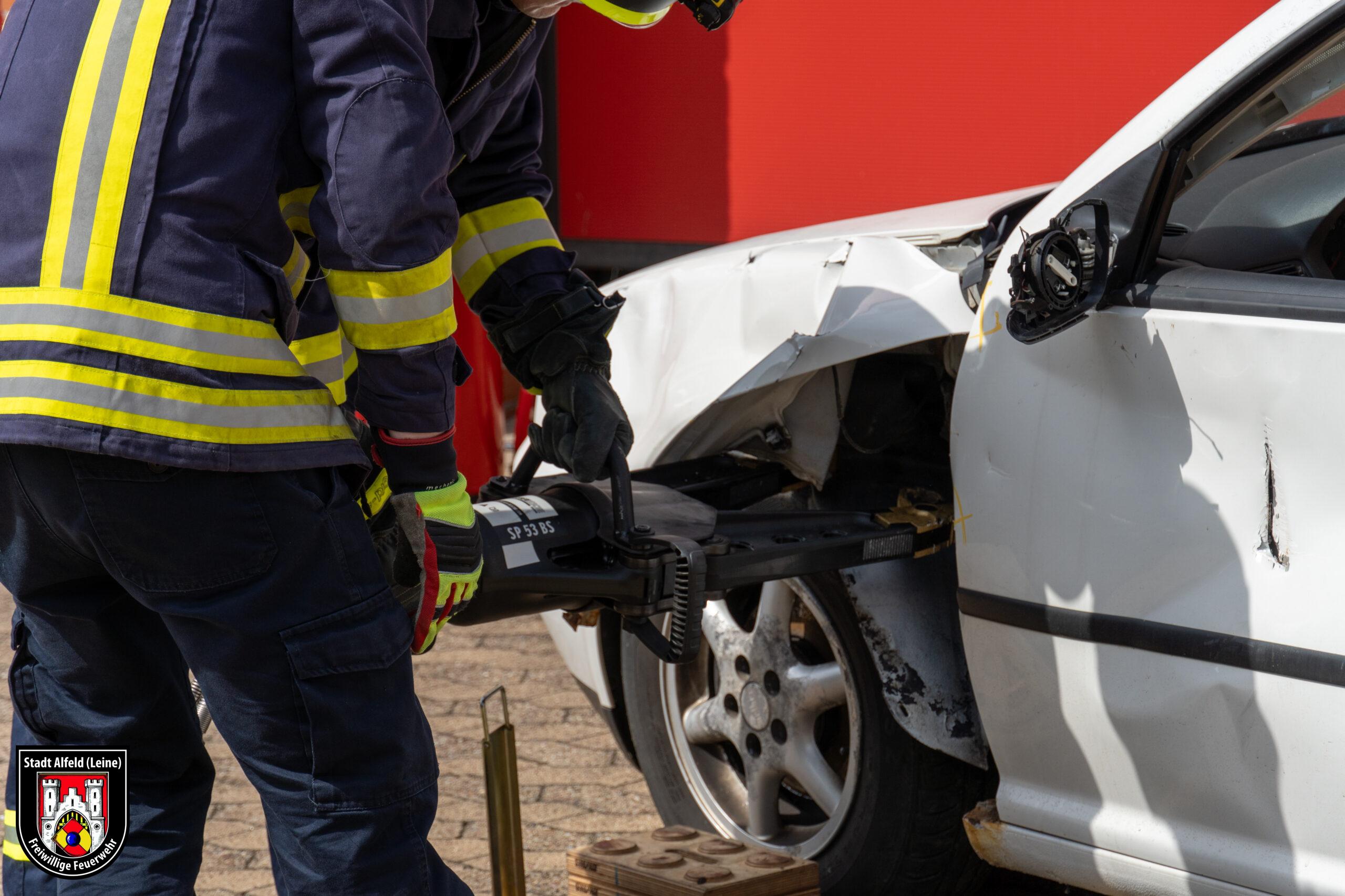 Die Einsatzabteilung rettete mit Schere und Spreizer eine eingeklemmte Person aus einem Auto.