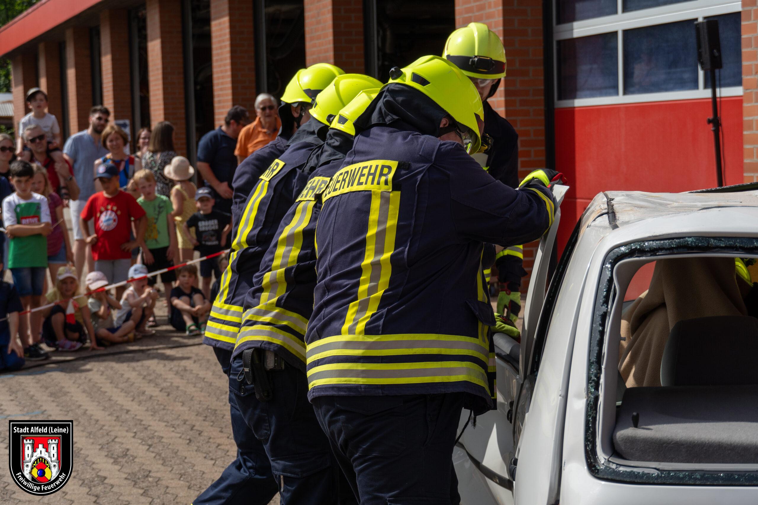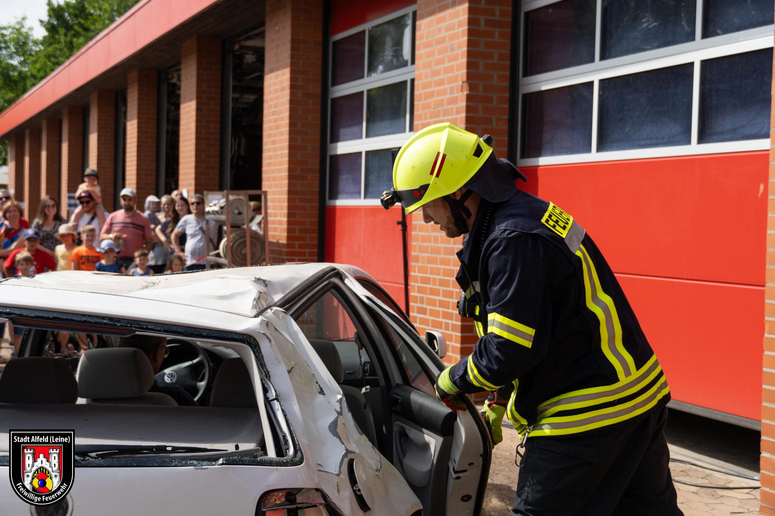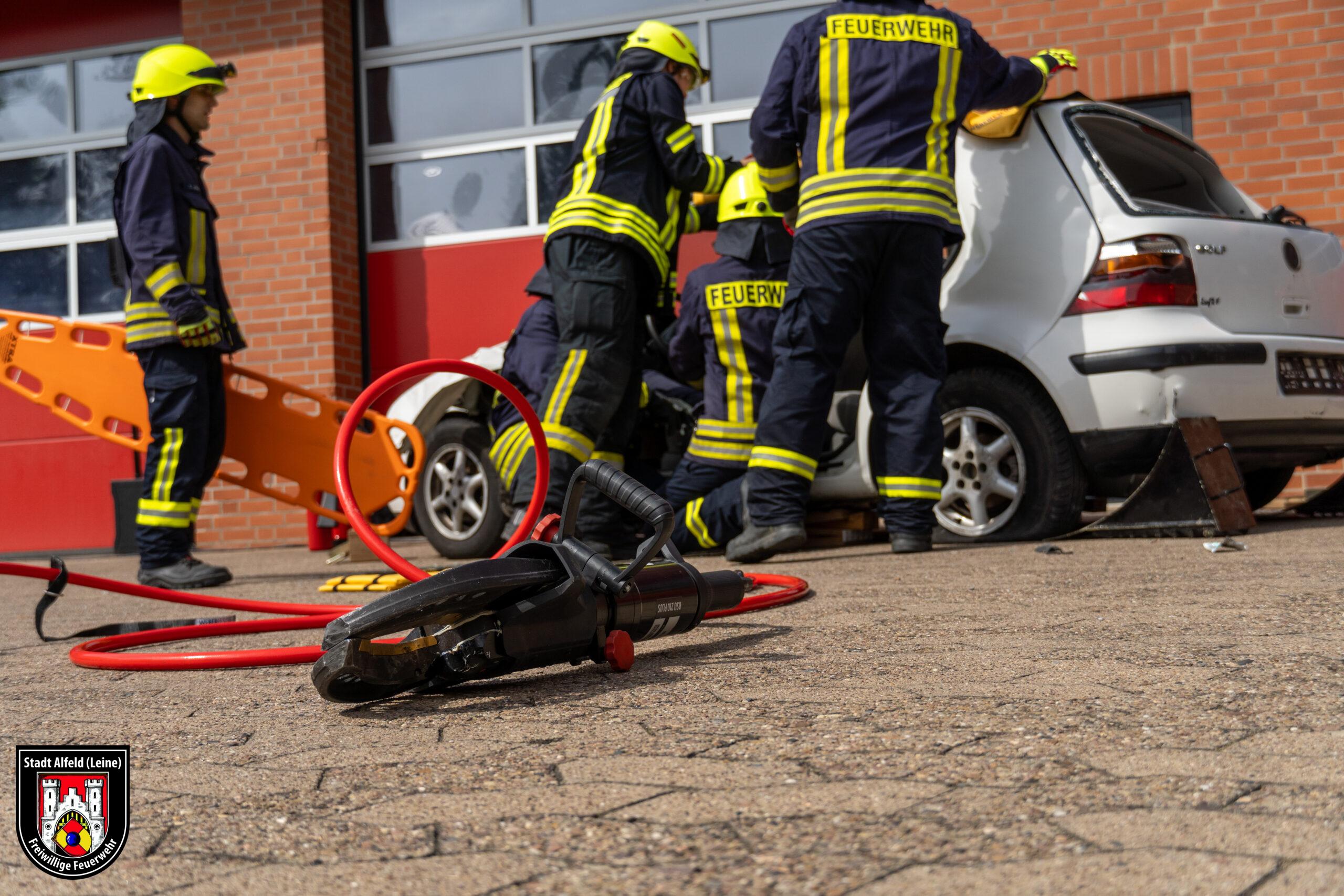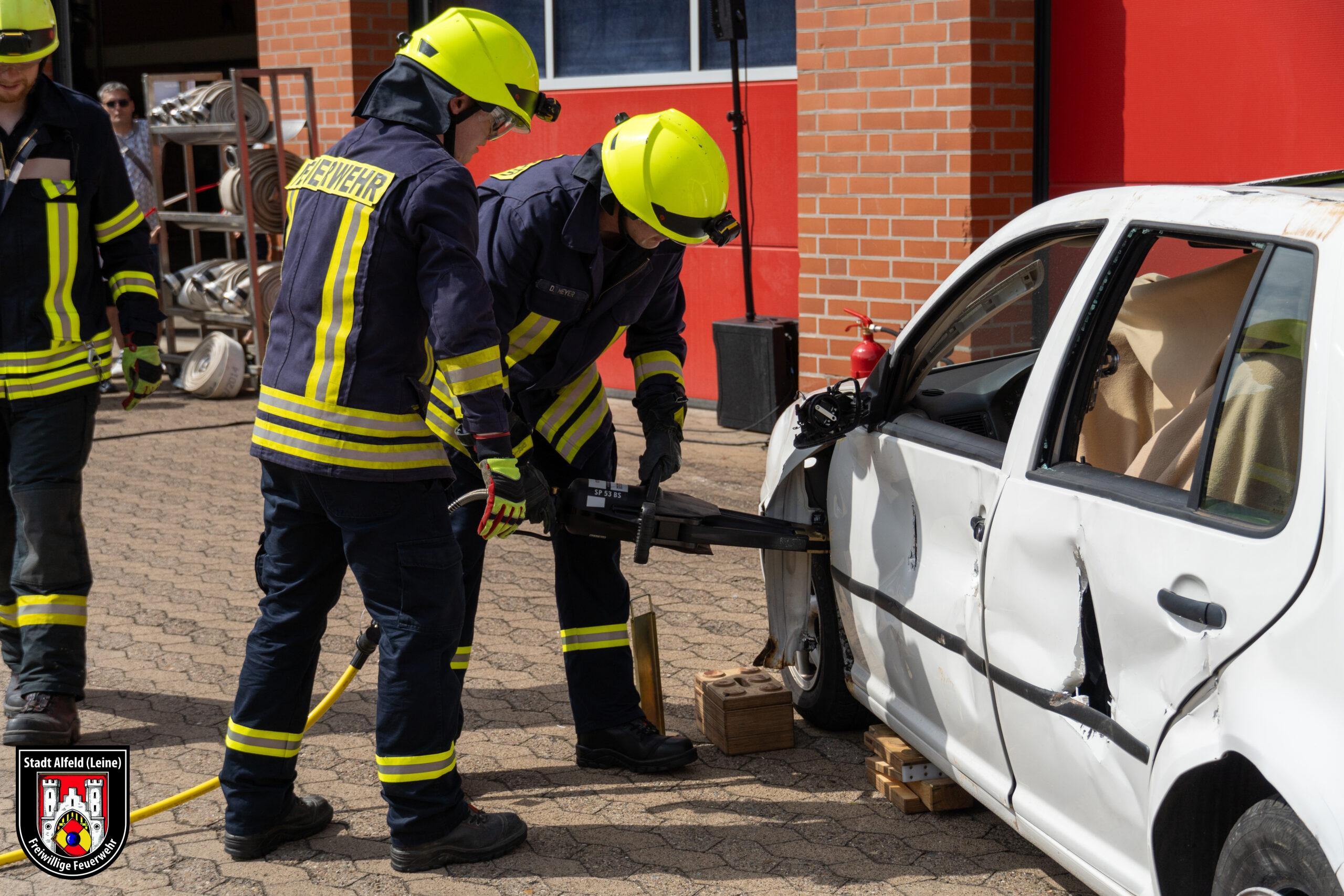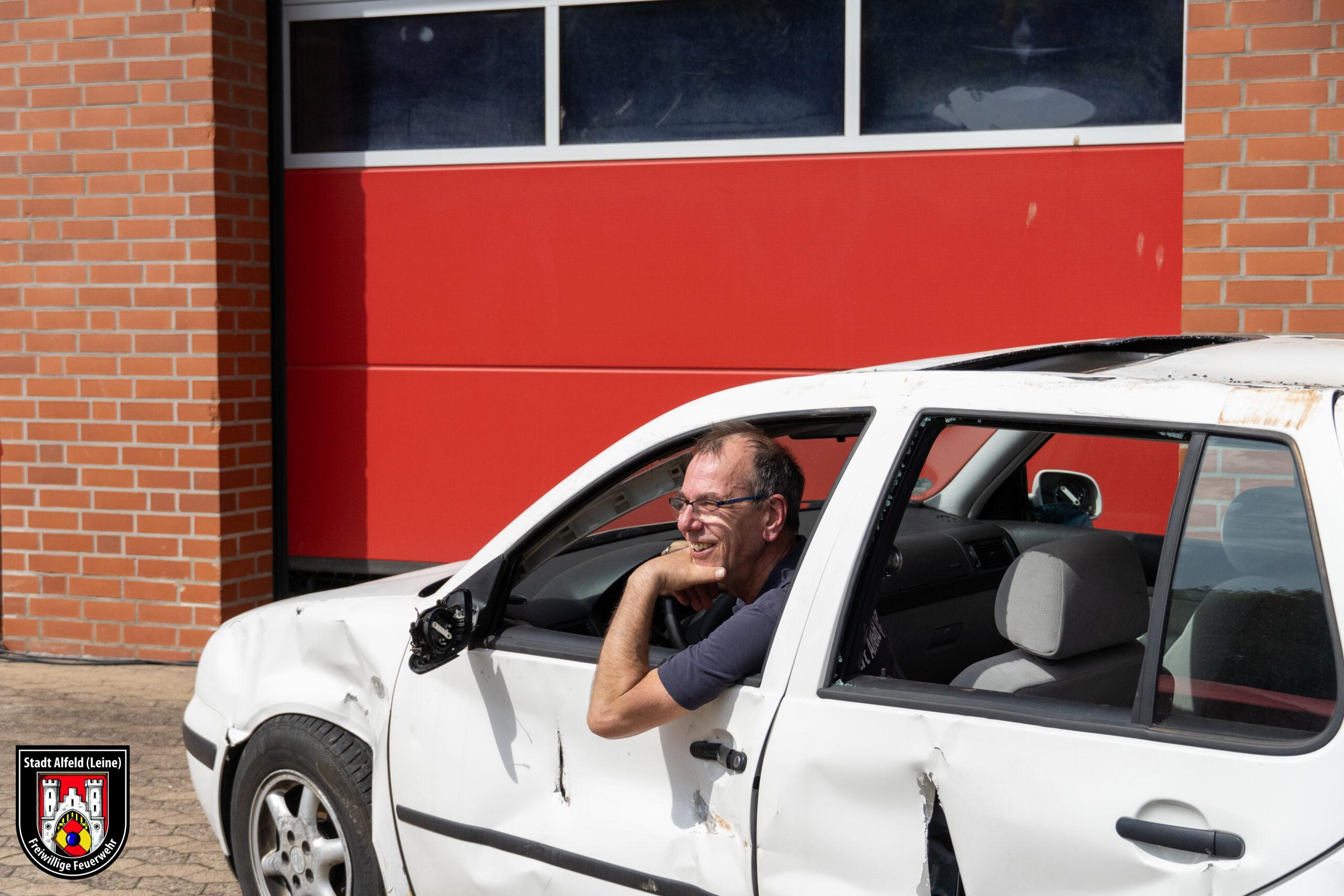 Die Einsatzabteilung rettete mit Schere und Spreizer eine eingeklemmte Person aus einem Auto.