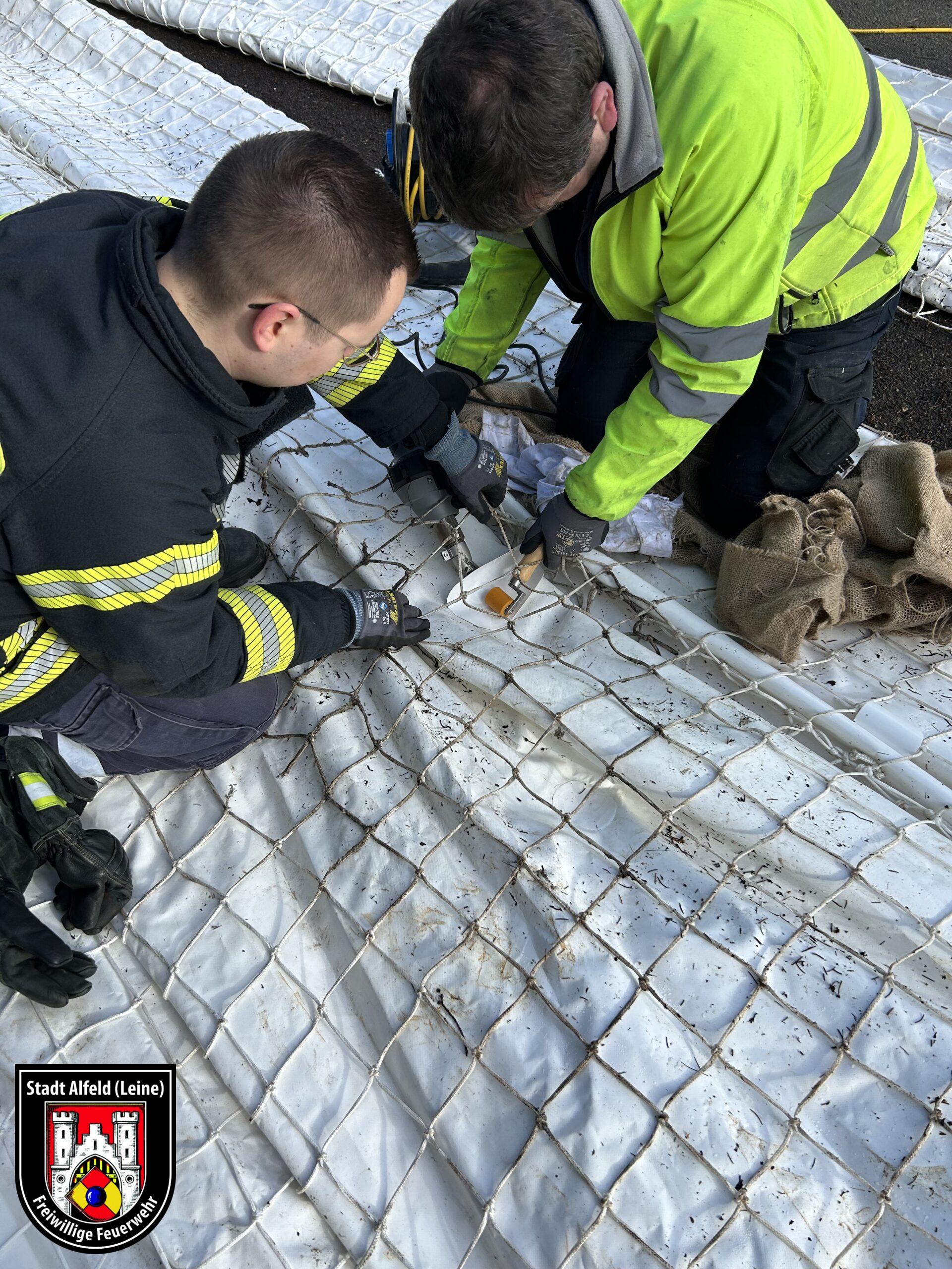 Am gestrigen Samstag (24.02.2024) trafen sich einige unserer Kameraden, um den im Dezember zum Hochwasserschutz aufgebauten Mobildeich zu flicken und wieder aufzurollen.