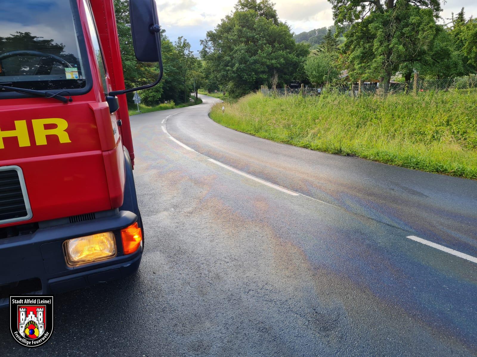 Alarmierung zu einer großflächigen Ölspur über die gesamte Fahrbahn im Bereich des Warzer Weges.