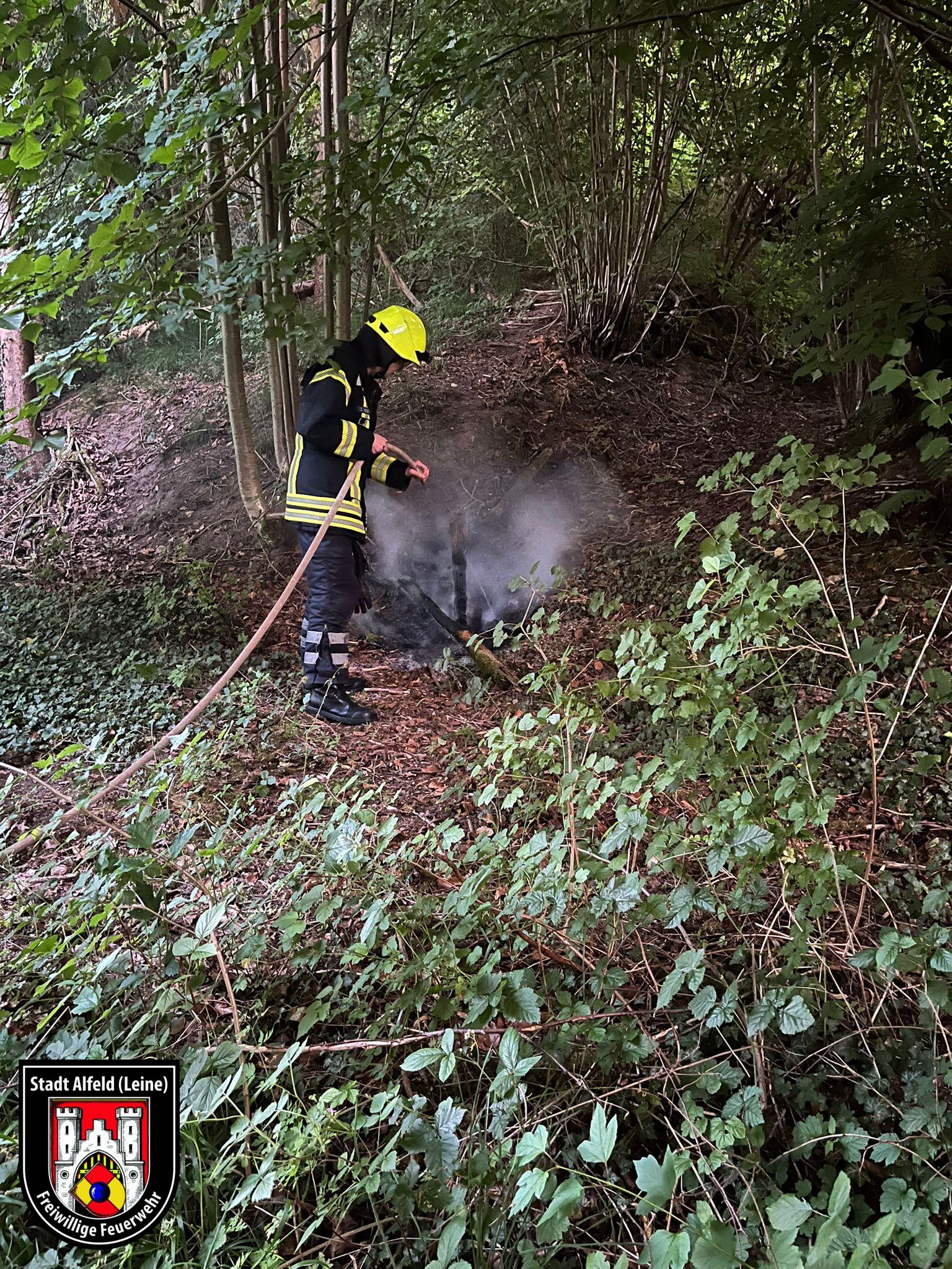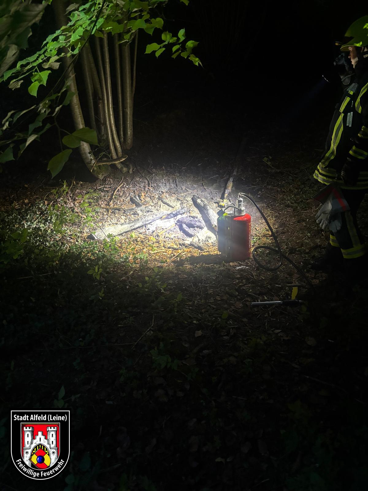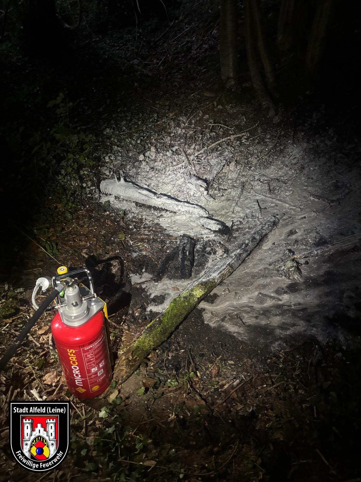 Die Löscharbeiten wurden mit Kleinlöschgerät (Hochdruchlöscher und Kübelspritze) durchgeführt und der Bereich abschließend mittels Wärmebildkamera kontrolliert.