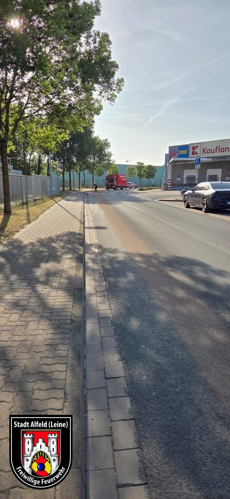 Kraftstoffspur mittels Bindemittel aufgenommen und ein Ölspurwarnschild aufgestellt.